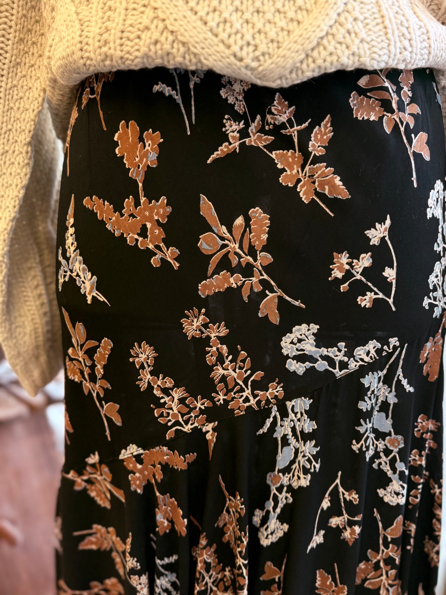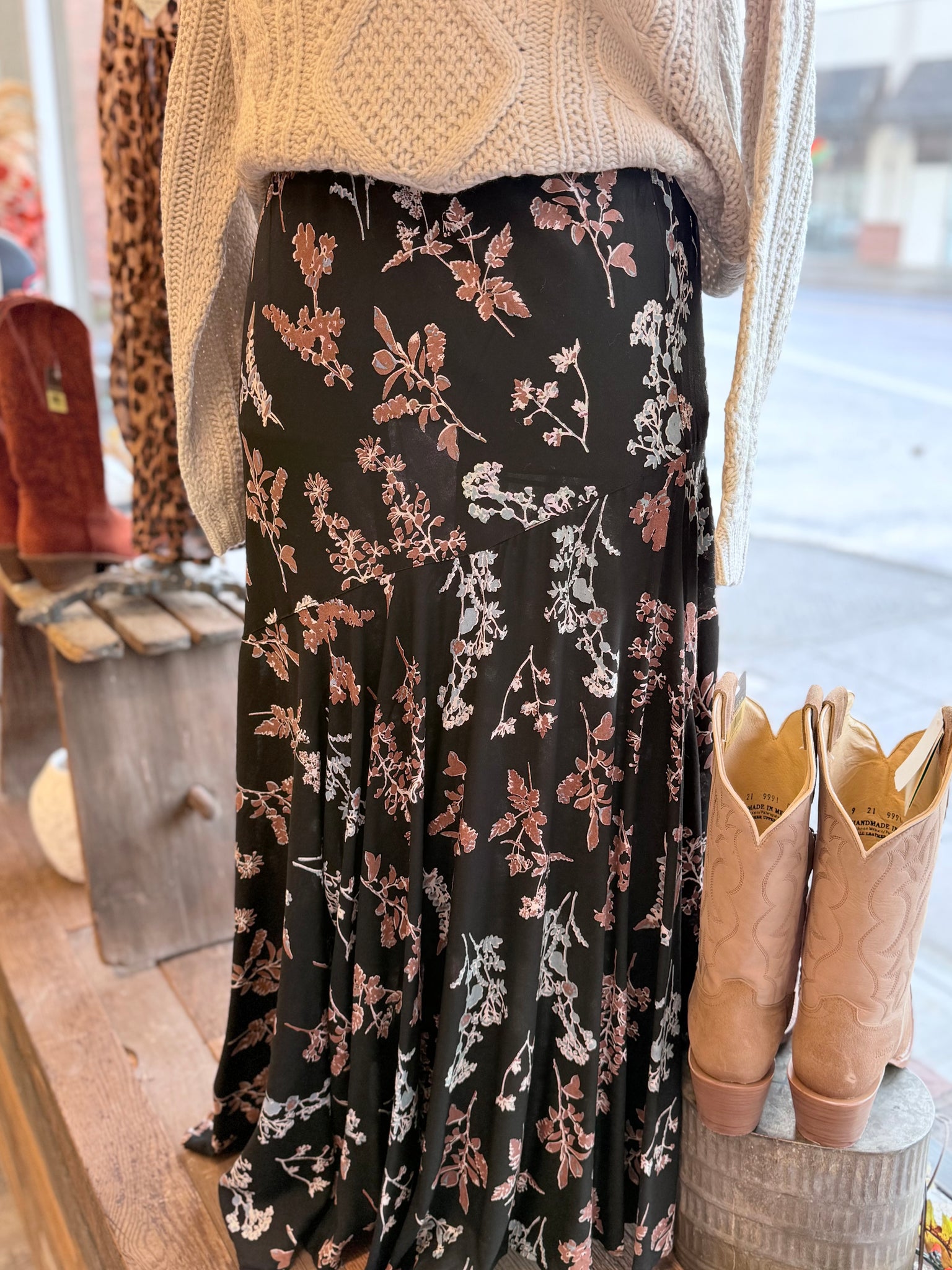 This black skirt is perfect to add to any wardrobe. Beautiful brown and blue floral accents throughout. Elastic skirt making it a comfortable wear. Pair this with your favorite blouse and heels for the office, or take it to the NFR with your favorite black boots, and black hat!