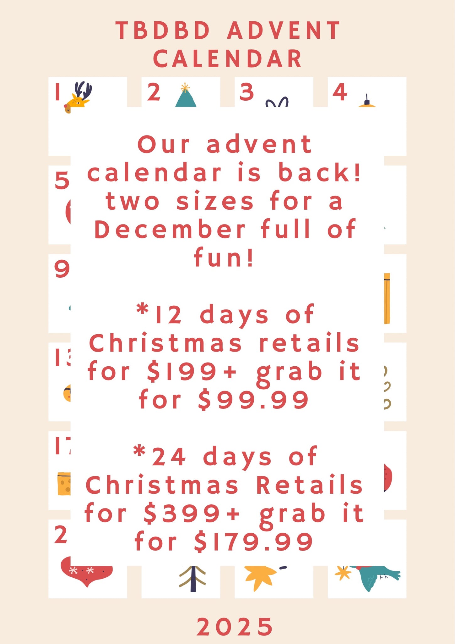 Introducing our 3rd season of TBDBD advent calendar!  Perfect to treat yourself all month long.  We have two different sizes: 12 Days of Christmas and 24 Days of Christmas.  These make awesome gifts as well!  Each calendar will be slightly different.  Great little deal as well as they retail for more than $100 more than what you pay!  Once purchased we will email you a little question form to get a little more info for you calendar.  Items may include but are not limited to: SEASONAL AND NON SEASONAL clothing, decor, gifts, accessories and more! Final sale.