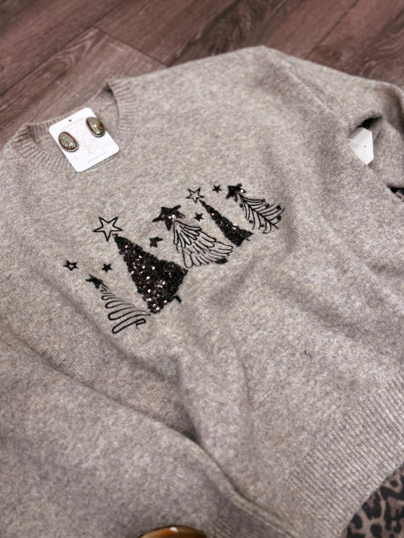 This adorable sweater will be one your wear all season long. The perfect neutral color with sequin trees on the front! Throw this on with all your favorite denim for the perfect outfit