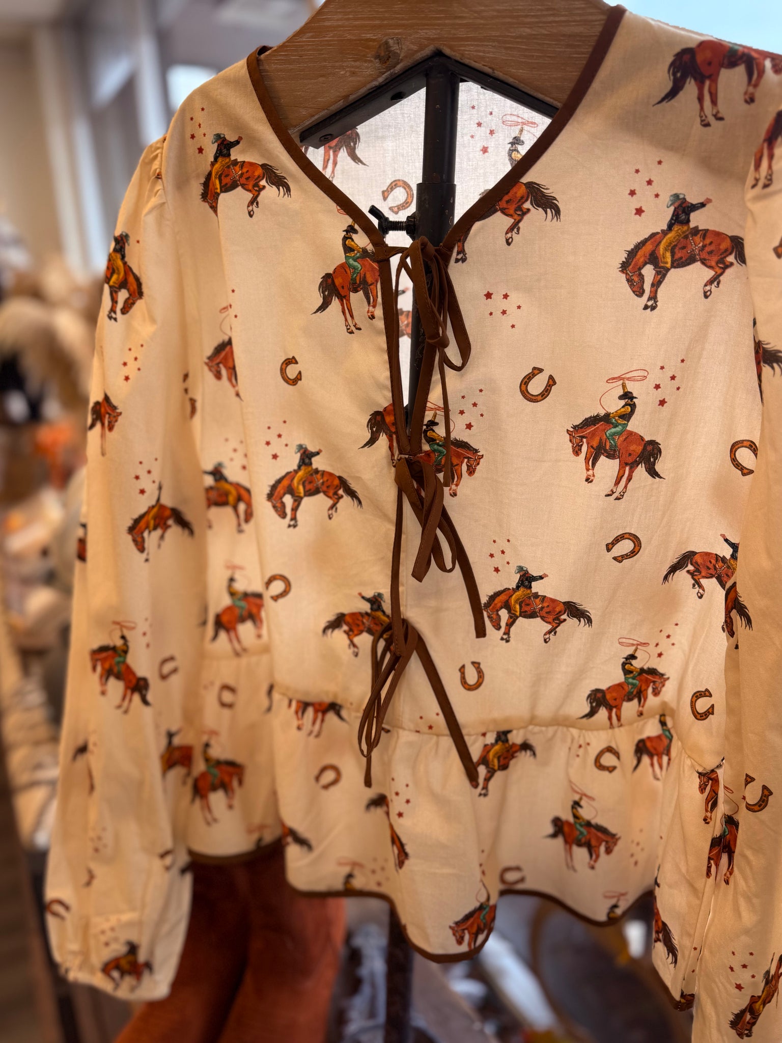 The cutest little cowboy blouse. This one has a slight babydoll cut to it. Three cute bow details. This one will be so cute with trousers and boots. Light weight so you can pair it with a cream colored vest or layer a tank underneath.